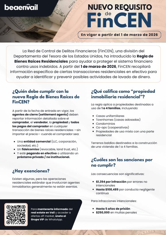 Si estás por comprar una propiedad en Vail (o en Estados Unidos) y estás considerando hacerlo mediante una LLC o un trust, conviene que conozcas este cambio. Desde el 1 de marzo de 2026 entra en vigor el nuevo esquema nacional de reportes de FinCEN para ciertas transferencias de bienes raíces residenciales.